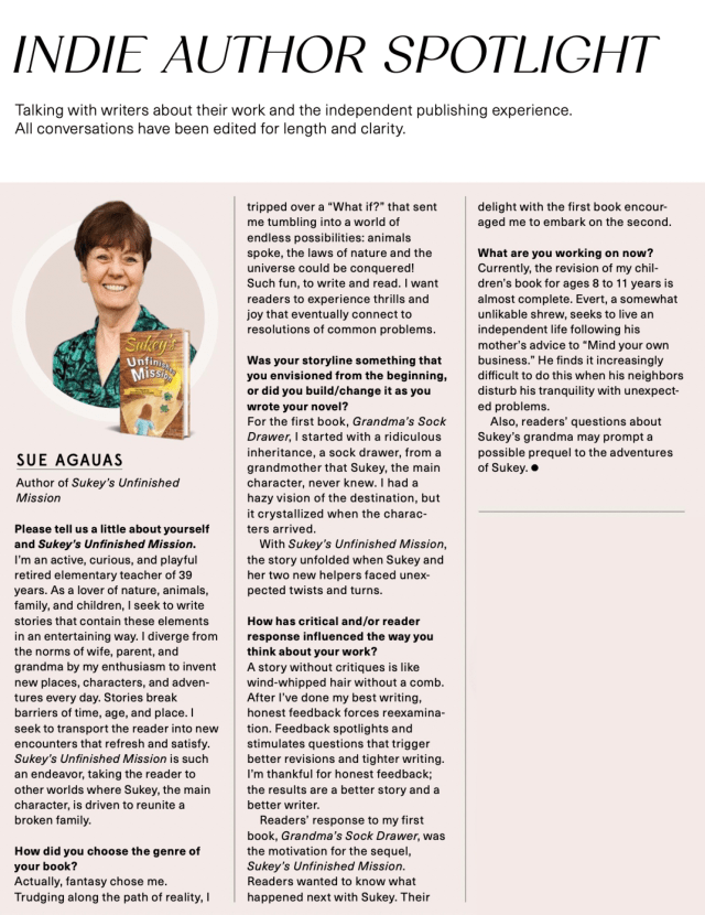 Author Sue Agauas is thrilled to be featured in Kirkus magazine in the issue that highlights indie-published books! Check out her author interview on page 188 about her latest book, Sukey’s Unfinished Mission, which is also on page 199. This issue is described as “Featuring 346 industry-first reviews of fiction, nonfiction, children’s and YA books; also in this special Indie Issue: a celebration of the rich diversity of indie publishing, interviews with indie authors, and more.”