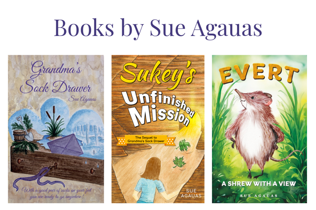 Sue has published two Middle Grade / Young Adult (YA) books called Grandma’s Sock Drawer and Sukey’s Unfinished Mission. She has also published an illustrated chapter book for ages 8-12 called Evert: A Shrew With A View. They celebrate the adventure of life and the power of love. Learn more about Sue’s books here: