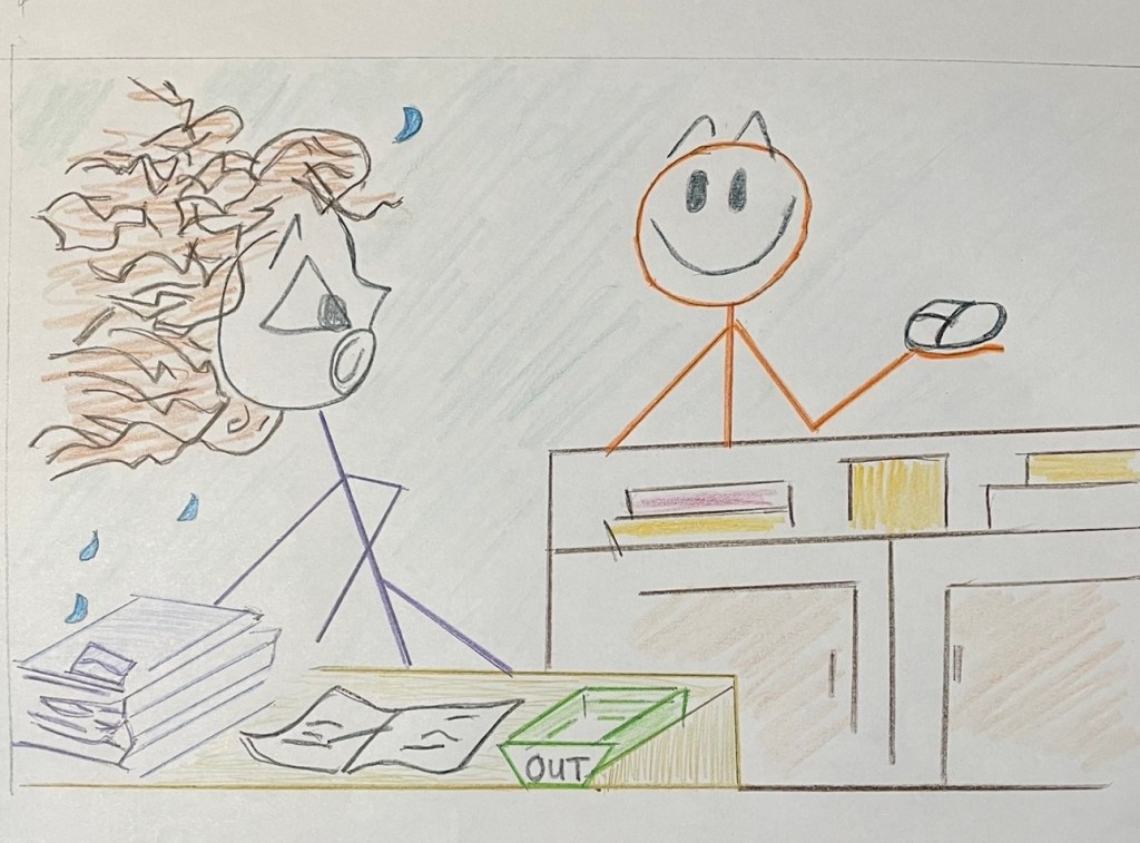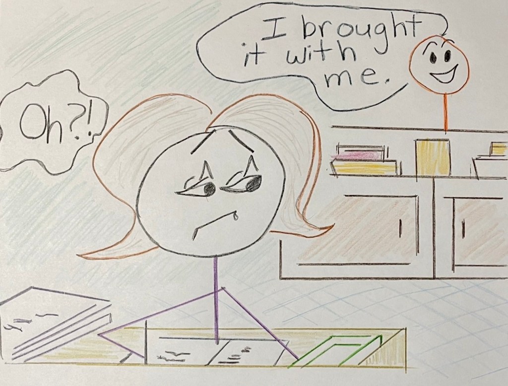 This “bit of funny” broke the stress and tension the secretary wrestled under, bringing a smile to her face and relief from, at least briefly, the stress of the job.
